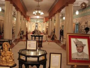 दरबार हाल, डायवनिंग हाल के अलावा यहां भारतीय भोजन दरबार भी है. इसमें मेहमानों को फर्श पर बैठकर सोने-चांदी के बरतनों में भोजन कराया जाता था. इसमें राजा के लिए बड़ा आसान लगाया जाता था. महल में राजा-महाराजा के वाहन, राज दरबार, बैठक हॉल सहित सभी चीजें देखने लायक हैं. महल में संग्राहालय का ये हिस्सा आज भी शाही मराठा सिंधिया राजवंश के निवास के रूप में जाना जाता है.